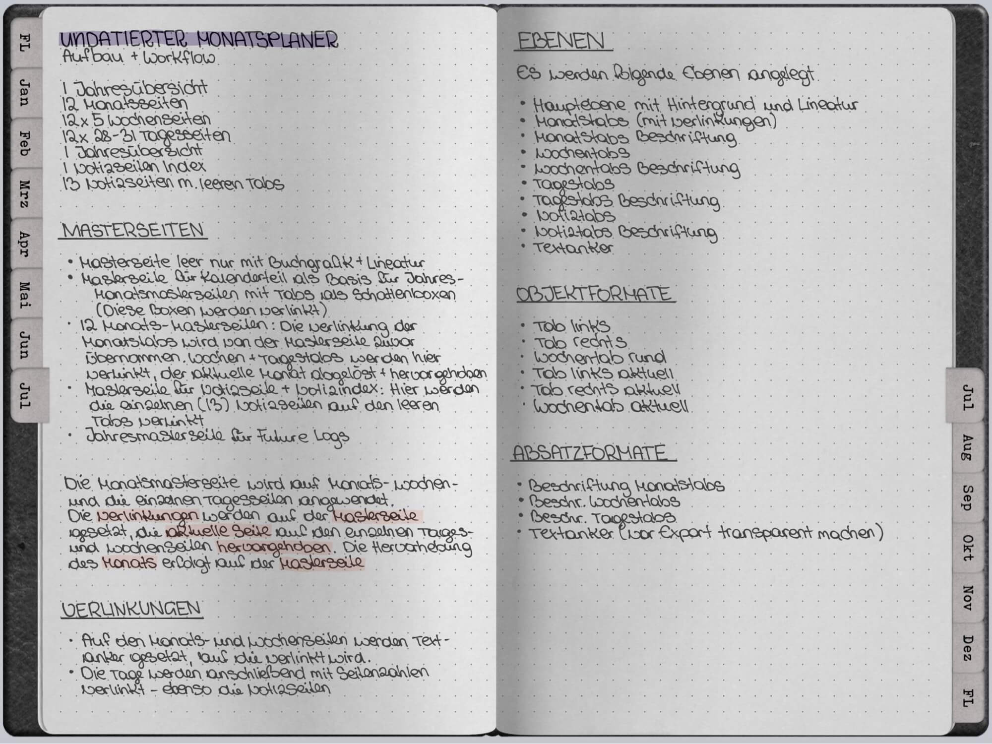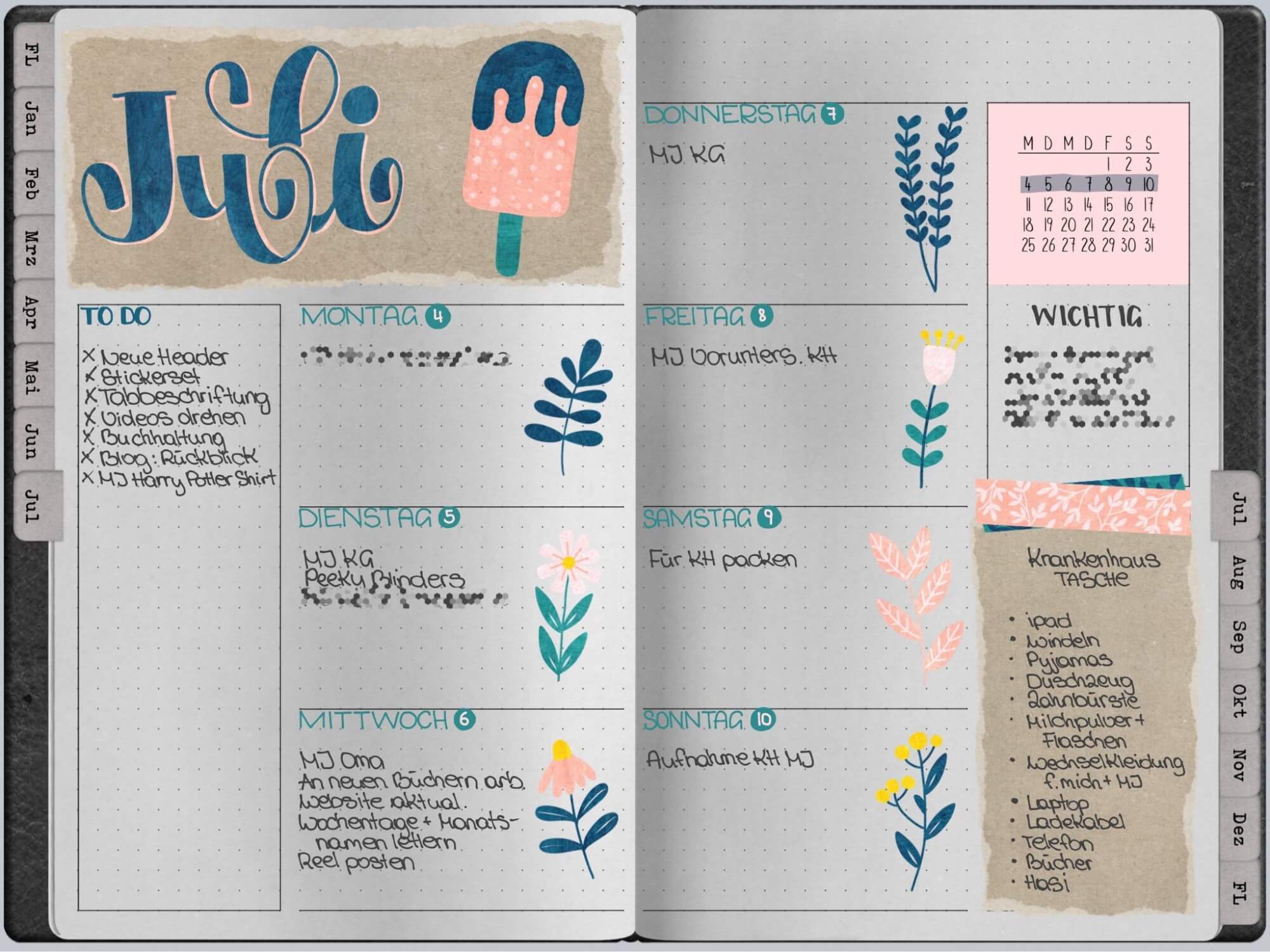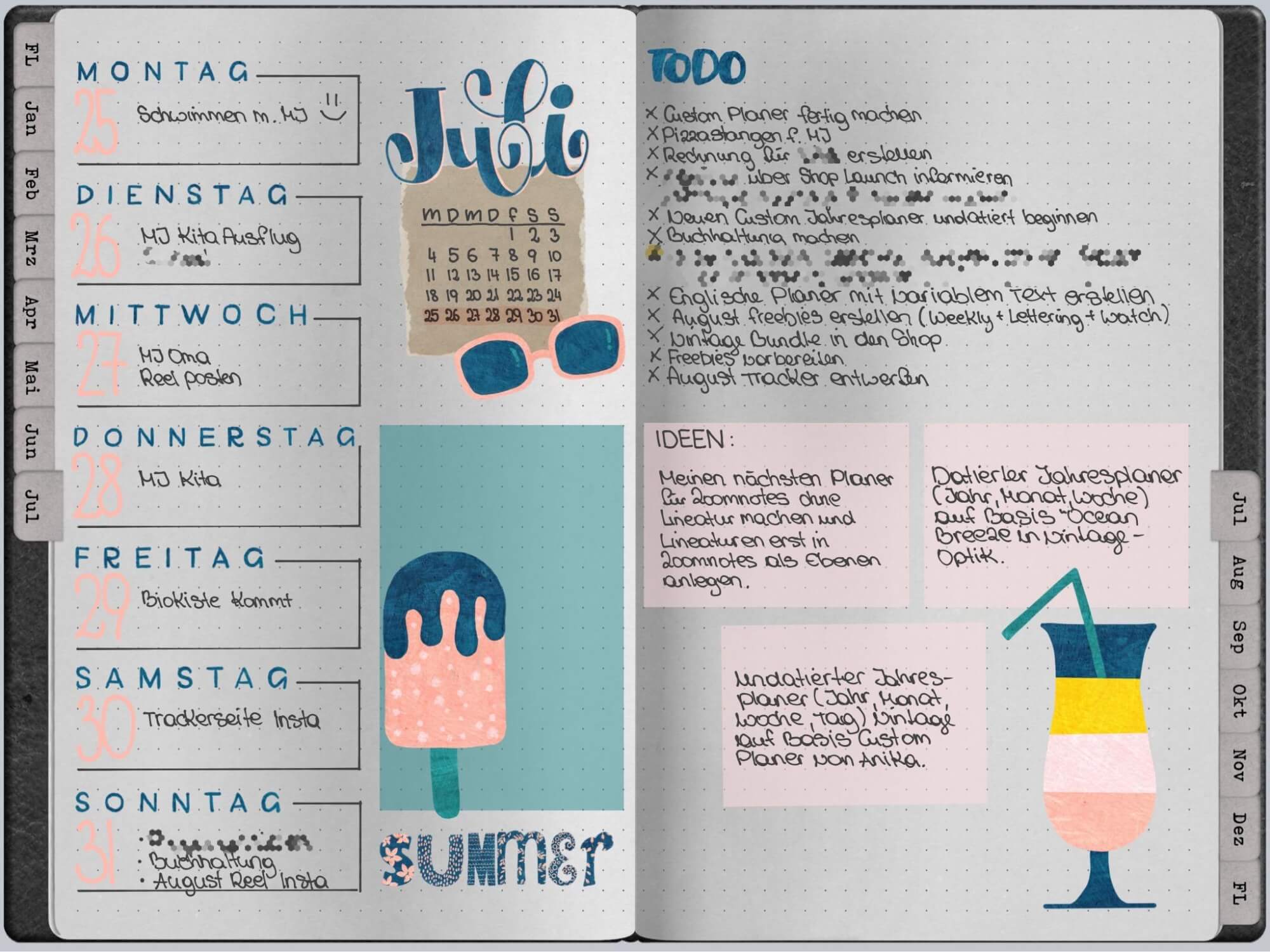 Die vergangenen Monate in meinem Journal waren sehr minimalistisch geplant und auch als Planertante habe ich nur sehr wenige Projekte in Angriff genommen. Das hat sich im Juli wieder gehörig geändert. Nicht nur meine Seiten sind wieder bunt, sie sind auch wieder funktional und wurden intensiv zur Projektplanung genutzt, wie ihr auf dem letzten Screenshot sehen könnt.