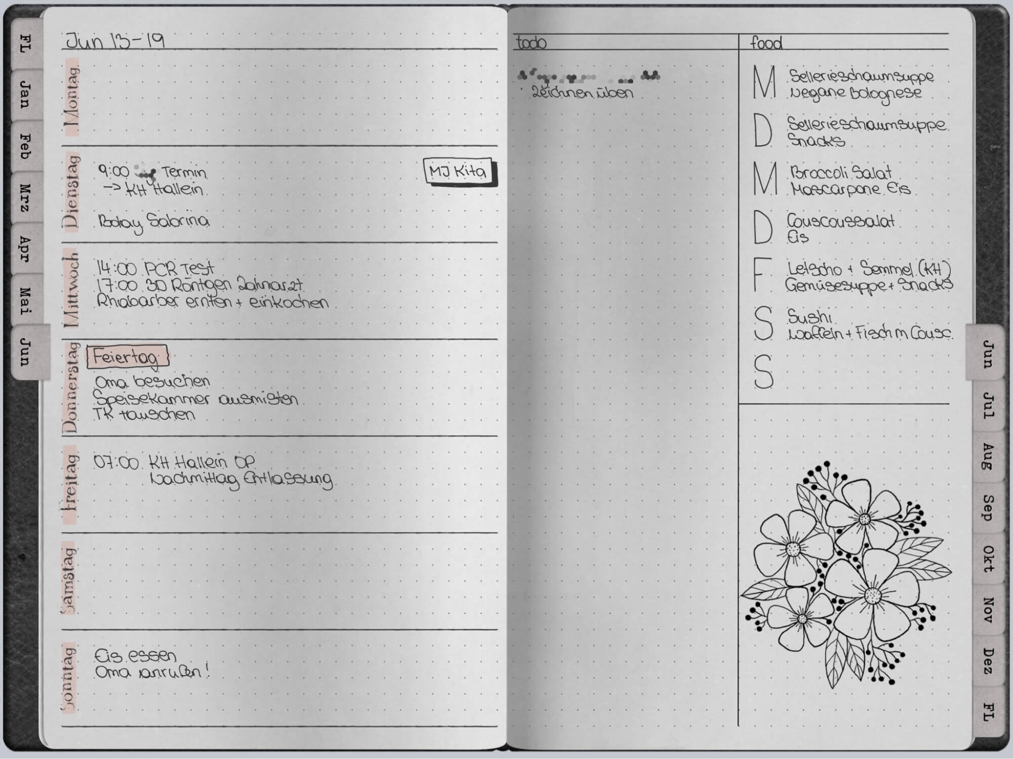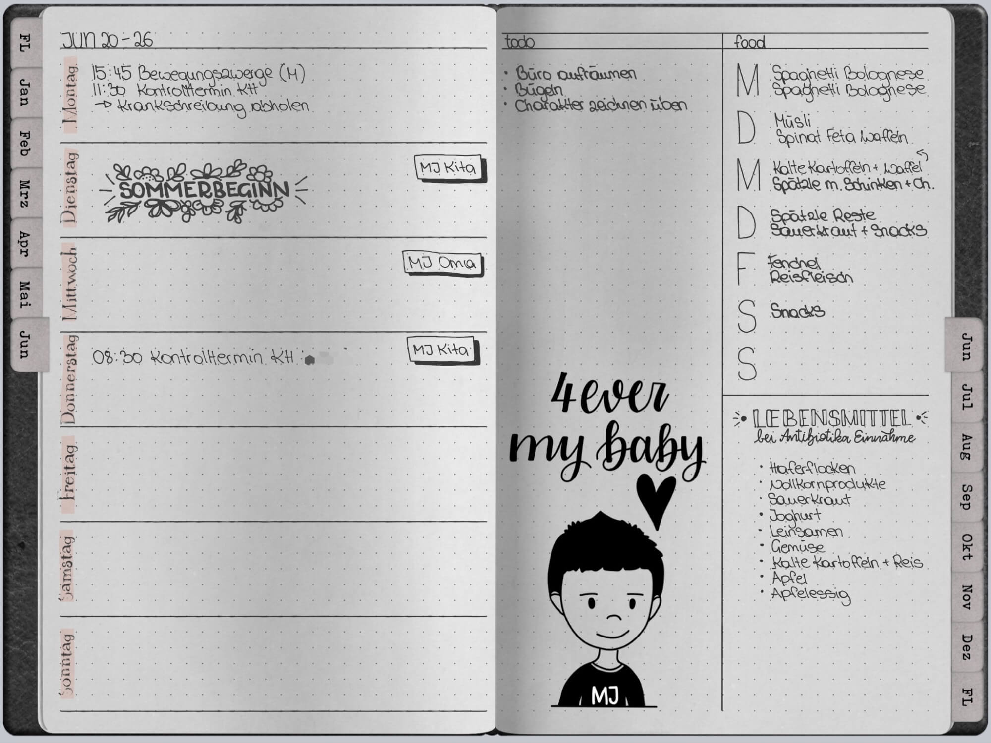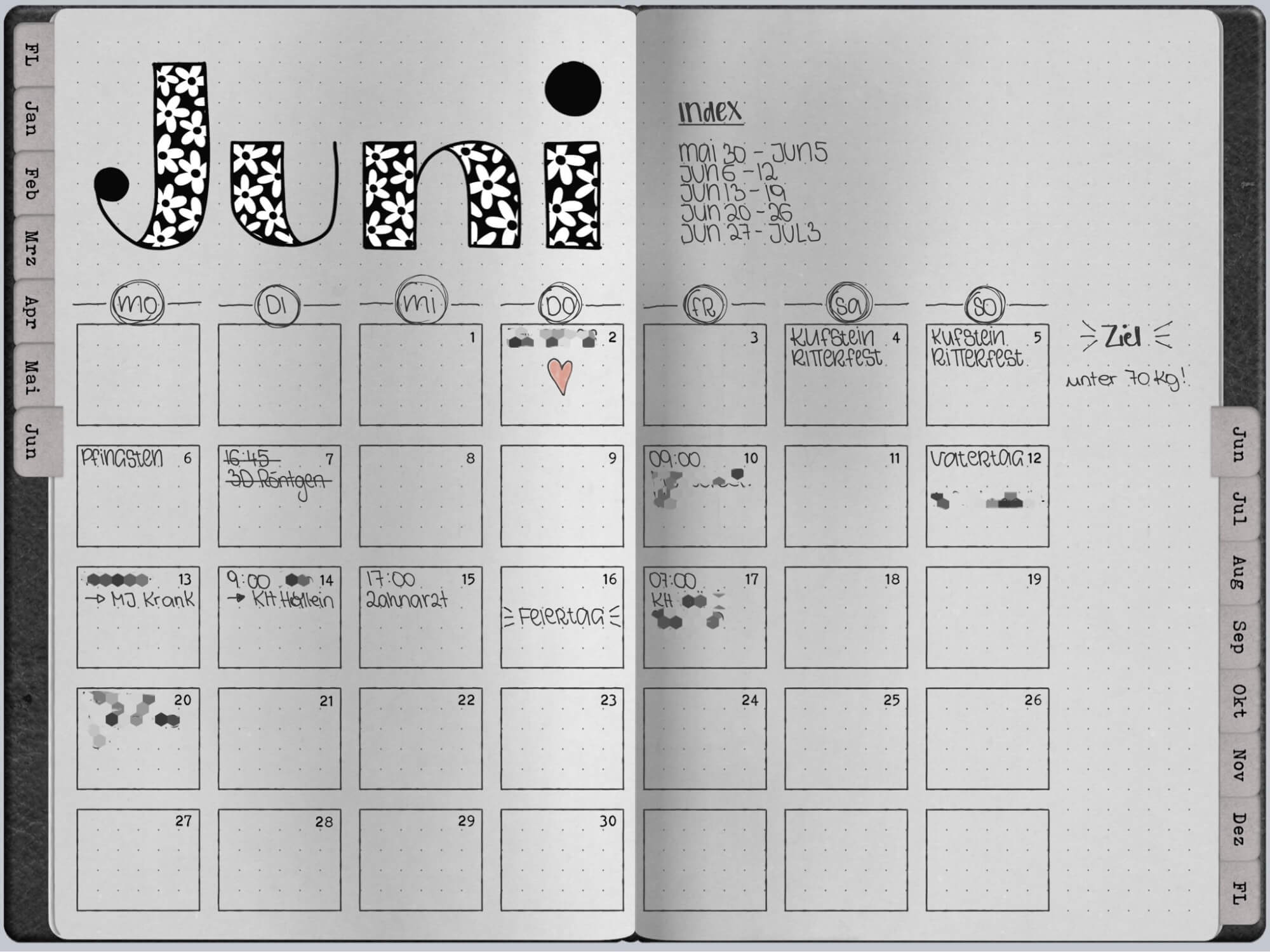In meinem persönlichen Monatsrückblick für den Mai >> habe ich über Minimalismus beim Planen geschrieben. Auch meine Juni Seiten fallen wieder in diese Kategorie. Auch wenn ich es geschafft habe, die in oder andere kleine Deko einzubauen, sind die Seiten nicht aufwändig gestaltet und lückenhaft. Das Erinnerungsboard,, ist für mich das optische Highlight im Juni. Alle verwendeten Elemente sind wieder selbst erstellt und gezeichnet.